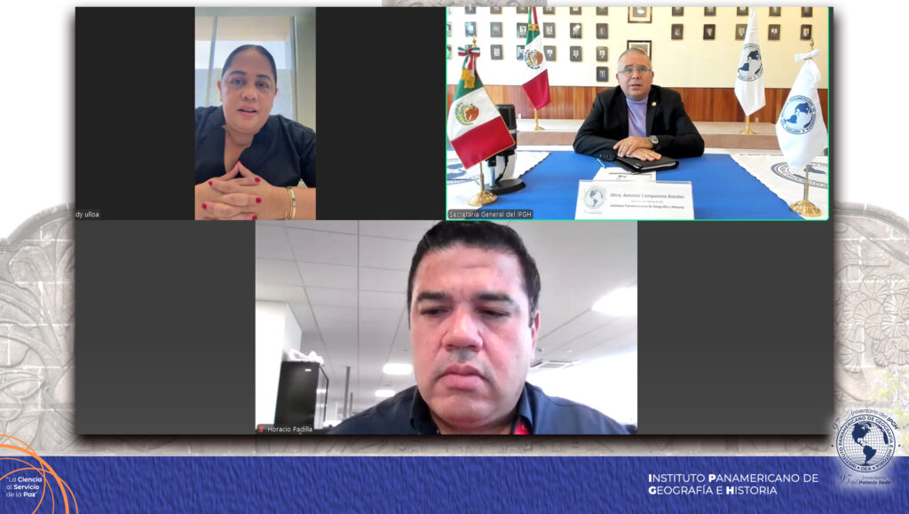 MA. Antonio Campuzano Rosales, Secretary General of the Pan American Institute of Geography and History (PAIGH), held a virtual meeting with Mrs. Leidy Ulloa, President of the PAIGH National Section in Honduras, and Mr. Horacio Ezequiel Padilla, Geography Coordinator for the General Directorate of Cartography and Geography of the Property Institute of that country.