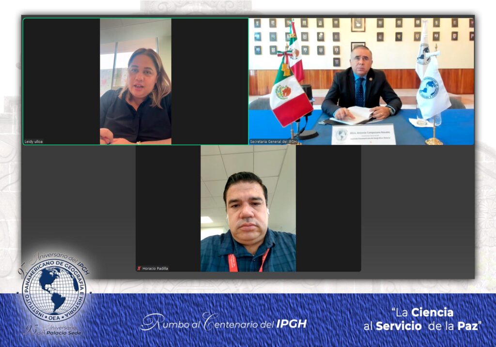 El Mtro. Antonio Campuzano Rosales, Secretario General del Instituto Panamericano de Geografía e Historia (IPGH), sostuvo una reunión virtual con la Ing. Leidy Ulloa, Presidenta de la Sección Nacional del IPGH en Honduras, y el Sr. Horacio Ezequiel Padilla, Coordinador de Geografía de la Dirección General de Cartografía y Geografía del Instituto de la Propiedad de dicho país.